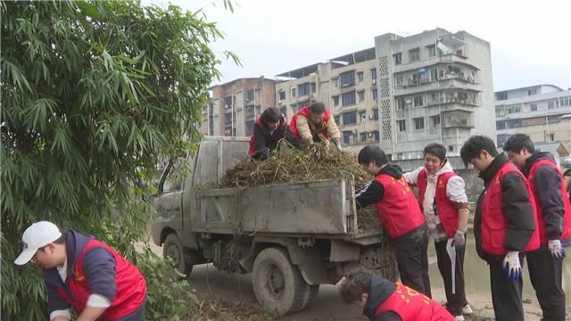 活动中,数十名身着红马甲的志愿者迅速分组、领取工具、明确区域后便投入劳动。大学生志愿者弯腰捡拾草丛中的垃圾,党员干部用夹子清理河岸杂物,还有人将农业生产垃圾分类装车,现场井然有序。